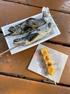 山の麓でヤマメ、イワナの塩焼きとお団子を頂きました?